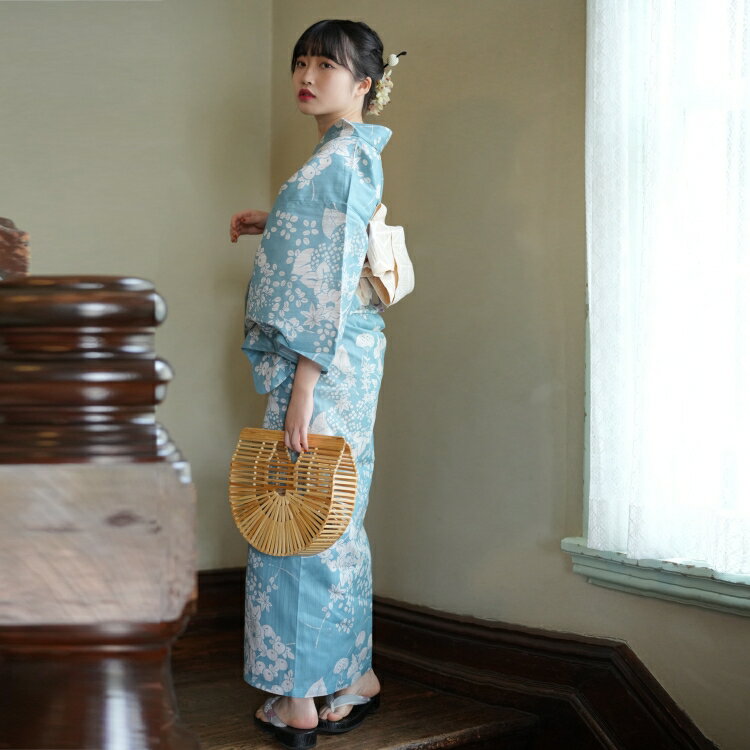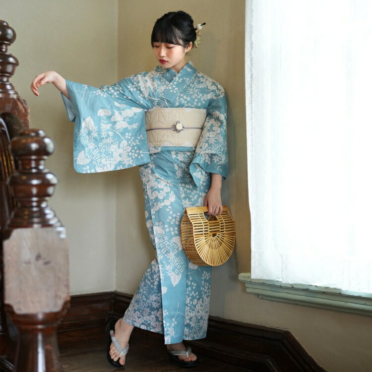 浴衣3点セット (浴衣/帯/下駄) utatane 3L ゆったりサイズ(身長155-165cm ヒップ130cm頃) 浴衣 セット 浴衣 レディース 花 セット 大人 青 系 女性 ladies ブルー 水色 ベージュ 菊 萩 おみなえし 紫陽花 あじさい 浴衣 帯 下駄 昭和初期 アンティーク 復刻 大正浪漫